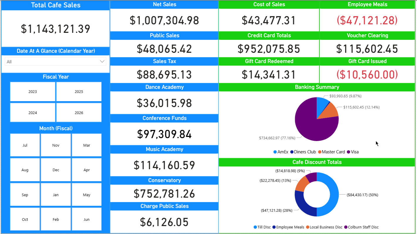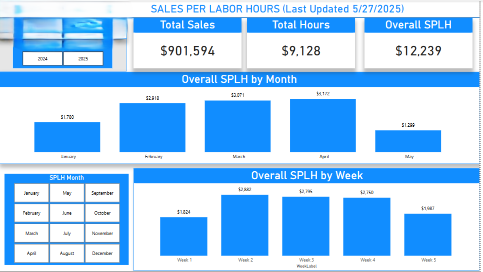 Developed a Power BI dashboard that automated manual Excel reporting by integrating an SQL-based POS system (to get sales data) and labor Excel files. The solution featured a few dashboards with six visuals for revenue trends, inventory measures, a SPLH dashboard with KPI cards and bar charts for labor efficiency, using fiscal year slicers, and month sorting. Built in 19.5 hours, it reduced manual work by ~90% and provided a scalable model for future enhancements, delivering clear insights for café management.