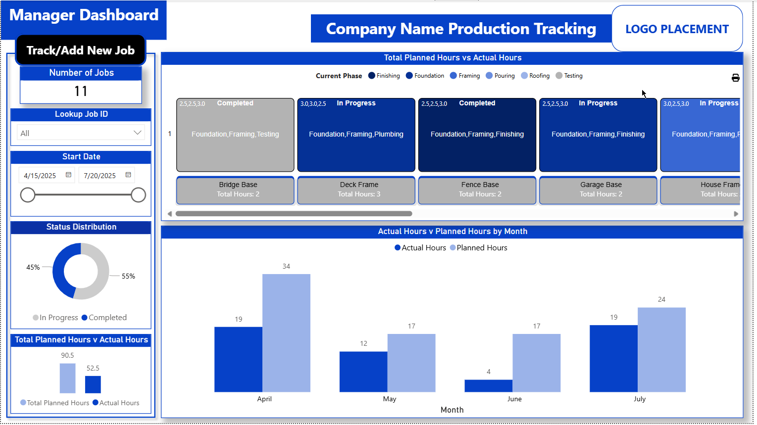 A Simplified Task View Production Tracking System for a small construction business. Built with Excel VBA macros and Power BI dashboards, it goes beyond basic statuses (Not Started, In Progress, Completed) to let project managers track jobs through phases (e.g., “Foundation” to “Framing”) and monitor actual vs. planned hours entered by operators.